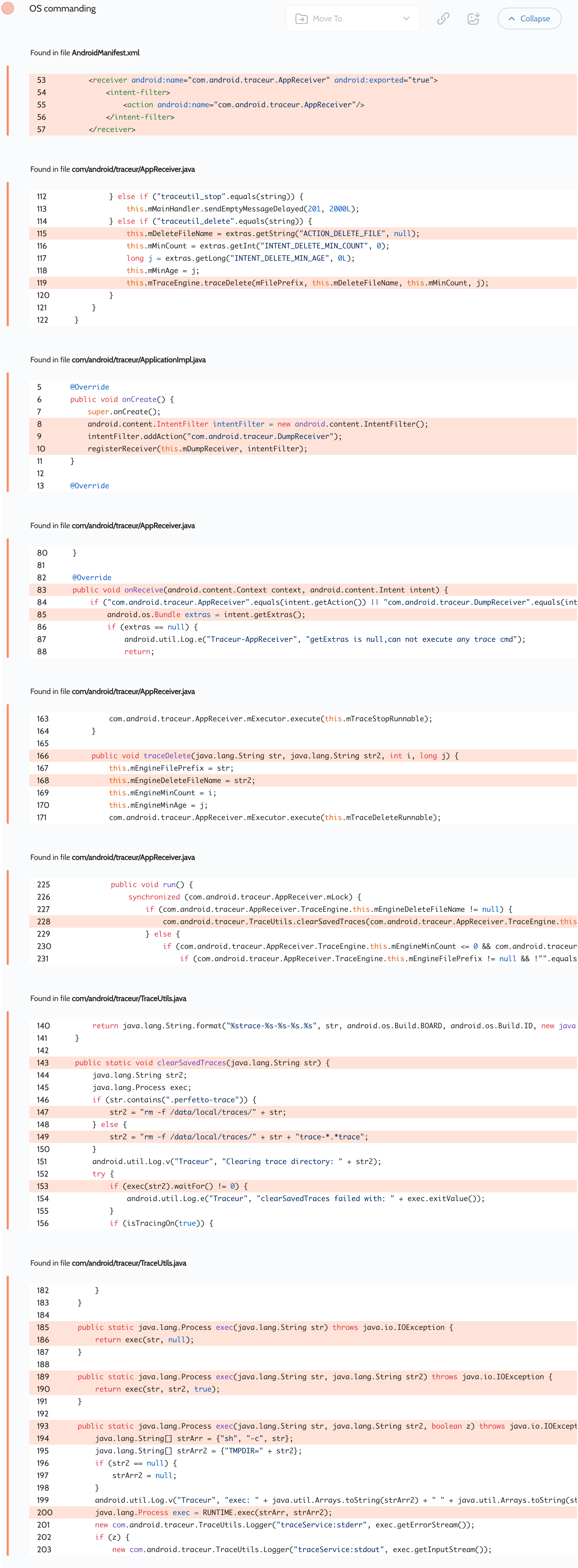 This app also comes from AOSP, but has been modified by Xiaomi. They added custom code to extend the dump functionality to the exported com.android.traceur.AppReceiver receiver, which does not check the received values and passes them directly to sh.