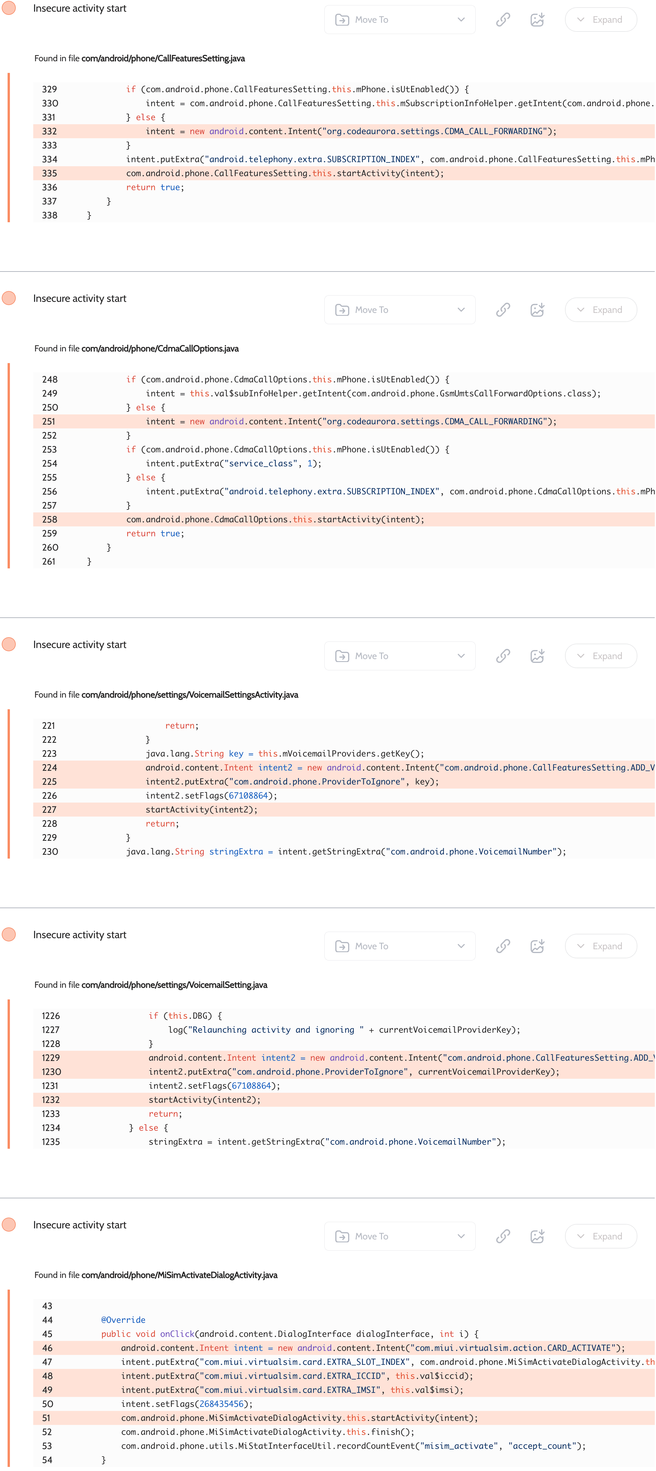 This app also comes from AOSP, but has been patched by Xiaomi. They added custom functionality, but it was vulnerable to implicit intent hijacking that exposed system values such as ICCID or IMSI of virtual SIMs.