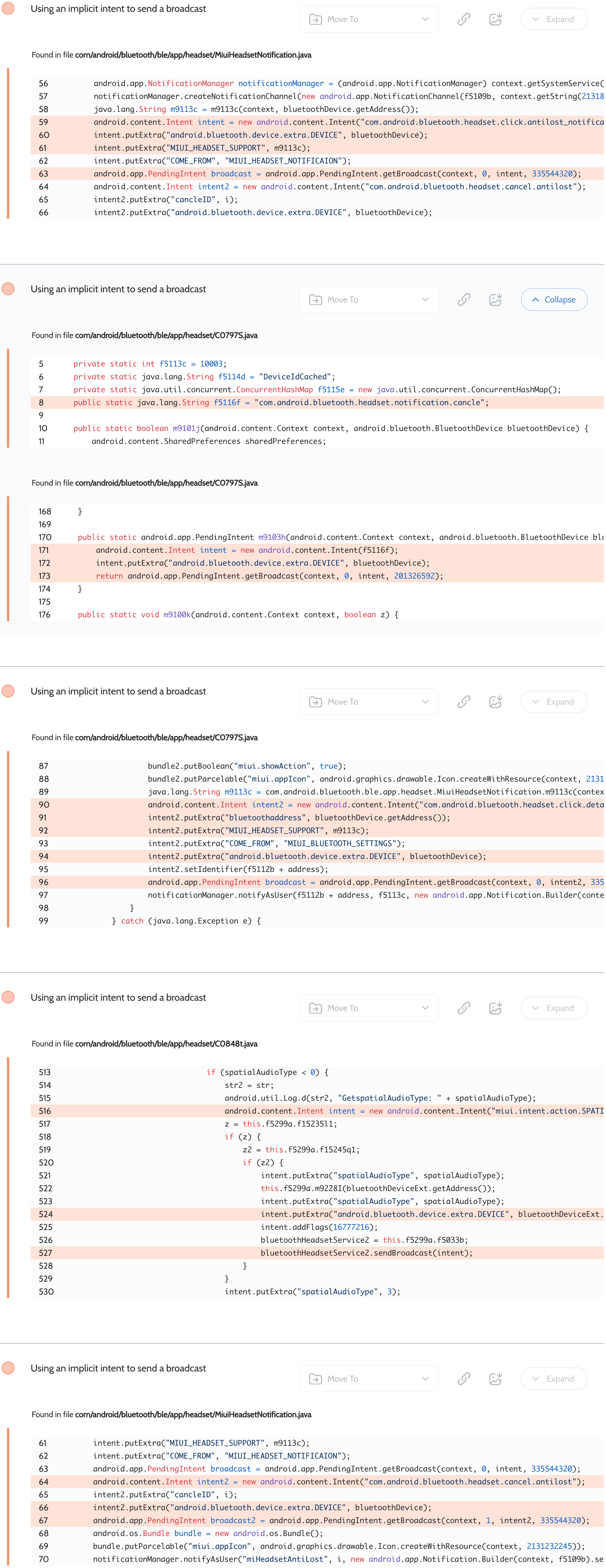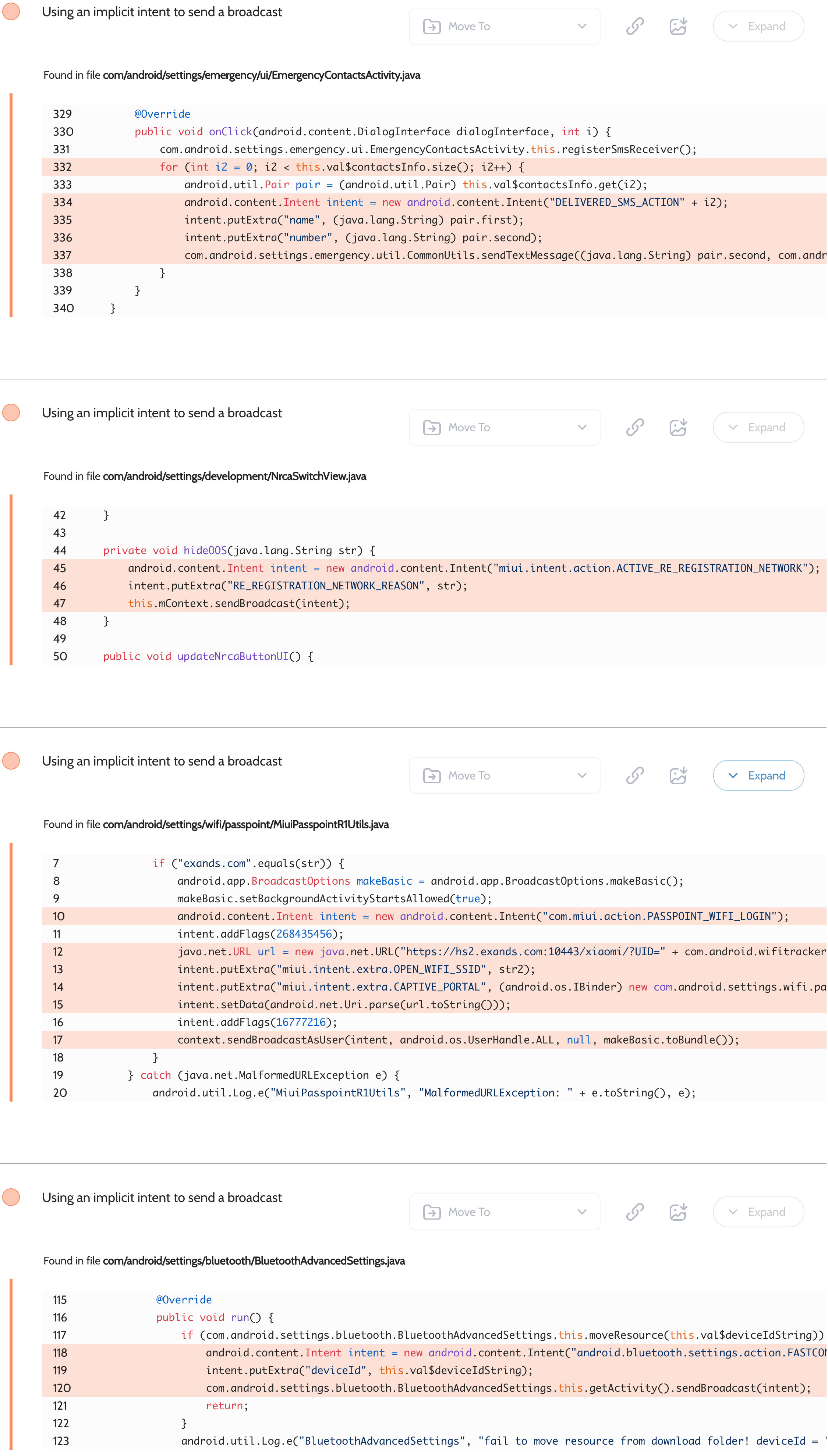 Xiaomi added its own functionality for additional settings that were not present in AOSP. As a result, these intents began to leak information about Bluetooth devices, connected Wi-Fi networks, and emergency contacts.