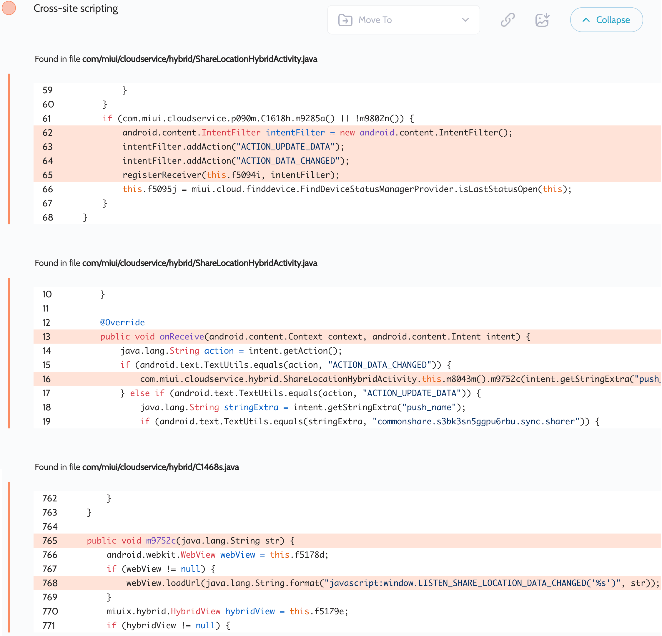 The com/miui/cloudservice/hybrid/ShareLocationHybridActivity.javafile contains an unprotected dynamically registered broadcast receiver that takes the push_data value, concatenates it to JS code, and then executes it.