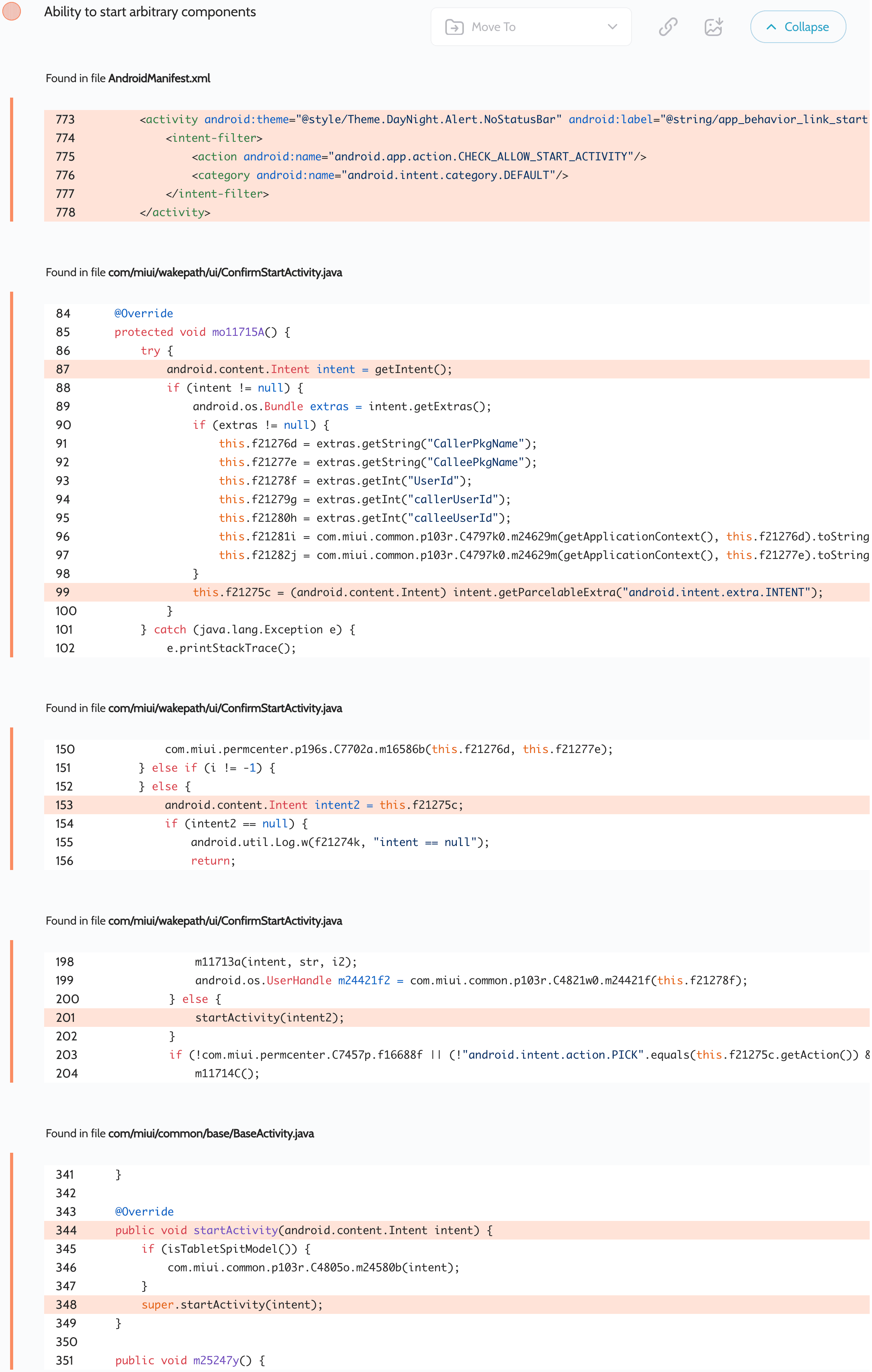 The exported activity com.miui.wakepath.ui.ConfirmStartActivity is designed to ask the user for permission to start an activity. However, it does not provide any explanation about the dangers of doing so. In addition, an attacker can control the caller and callee names.
