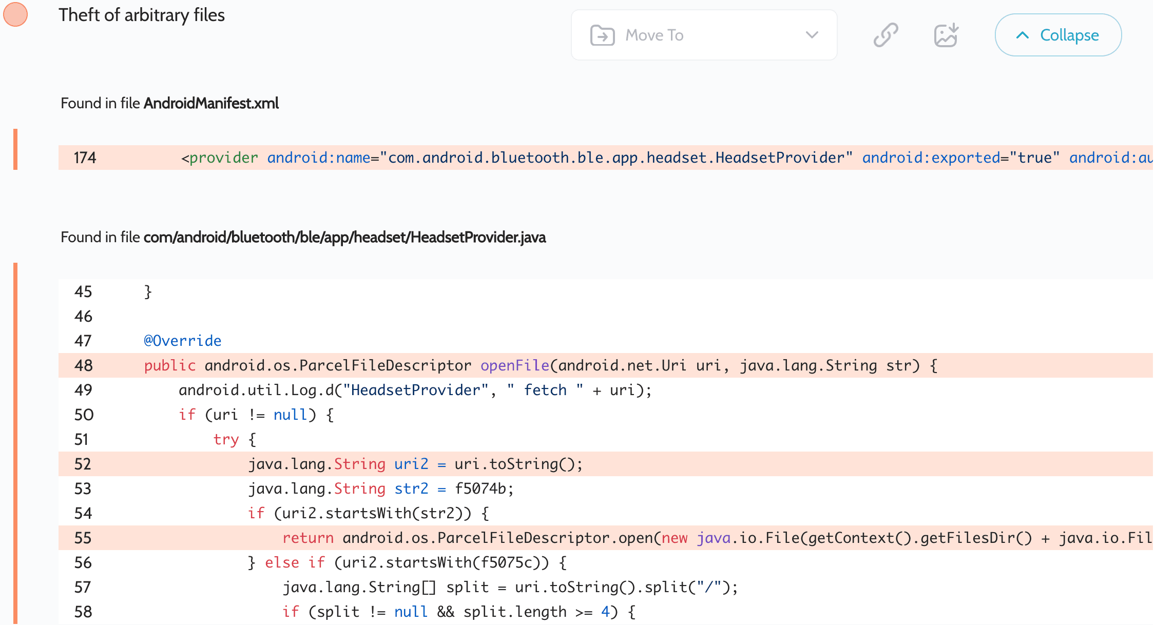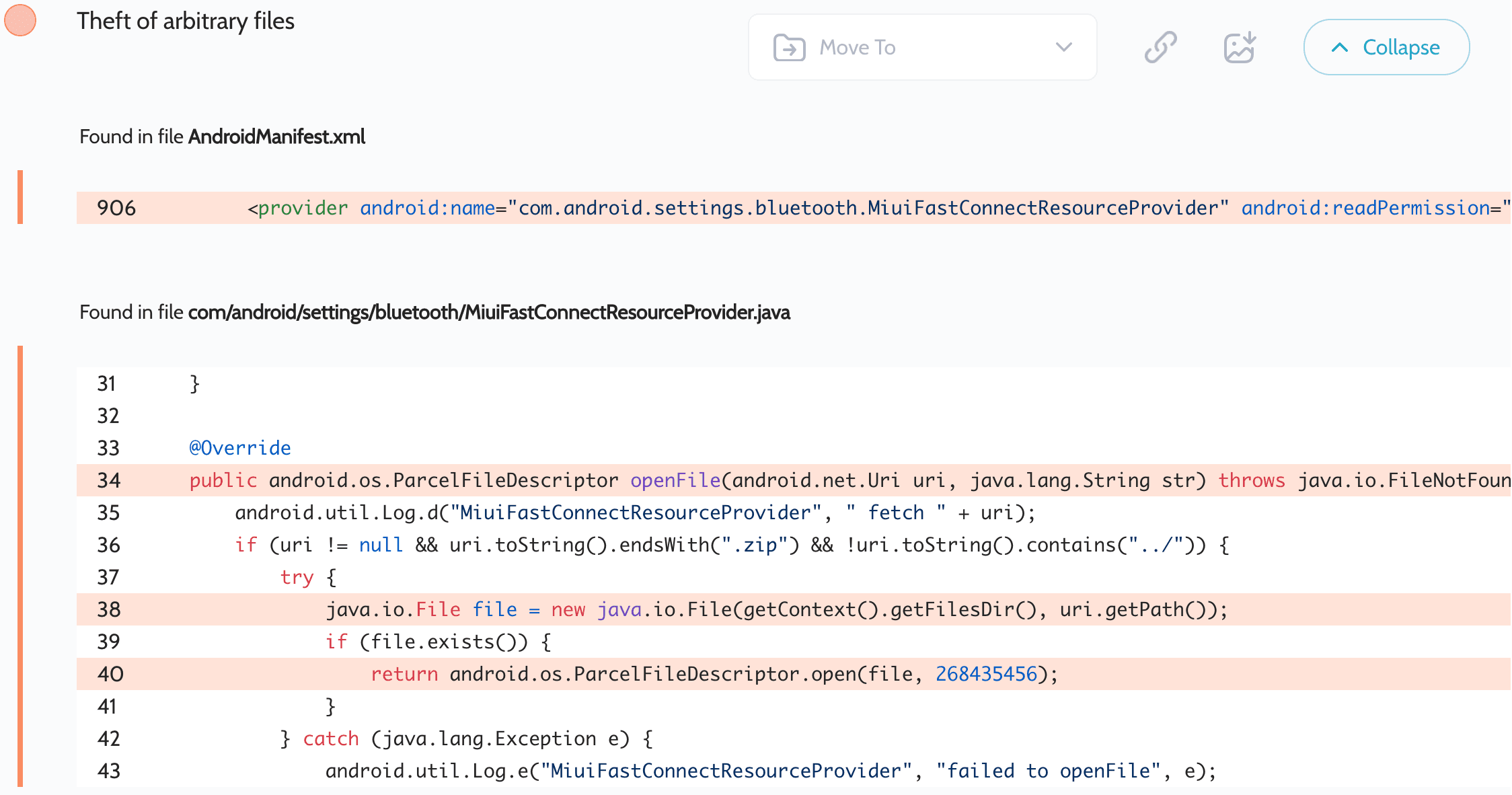 Similar to the previous vulnerability, Xiaomi added the exported com.android.settings.bluetooth.MiuiFastConnectResourceProviderprovider to the app. This provider requests a system permission to read files, but does not internally check if the file access flag is set to read files. In addition, the provider code contains attempts to protect against bad URIs, but they are insufficient. For example, the two validations uri.toString().endsWith(".zip") && !uri.toString().contains("../") can be bypassed using URI tricks such as encoding and URI hash part.