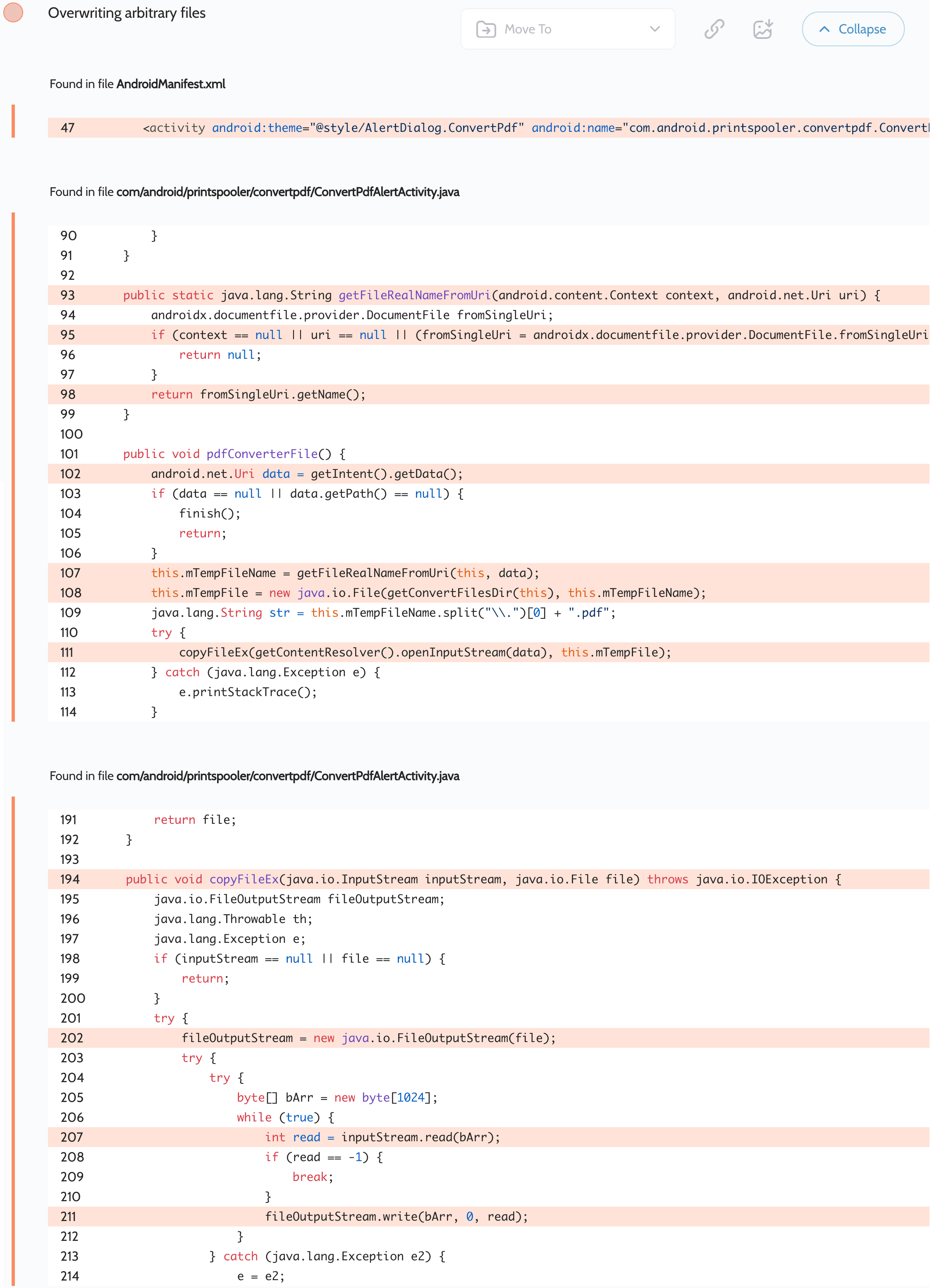 This app also comes from AOSP, but has been patched by Xiaomi. The app processes third-party URIs in the exported com.android.printspooler.convertpdf.ConvertPdfAlertActivityactivity. It automatically caches the content from it and uses the attacker-controlled _display_name value to form the output file path. The application uses the androidx.documentfile AndroidX library. However, both it and Android Framework classes such as android.provider.DocumentsProvider do not validate values in any way. This allows the attacker to inject special characters like / and extend the attack.
