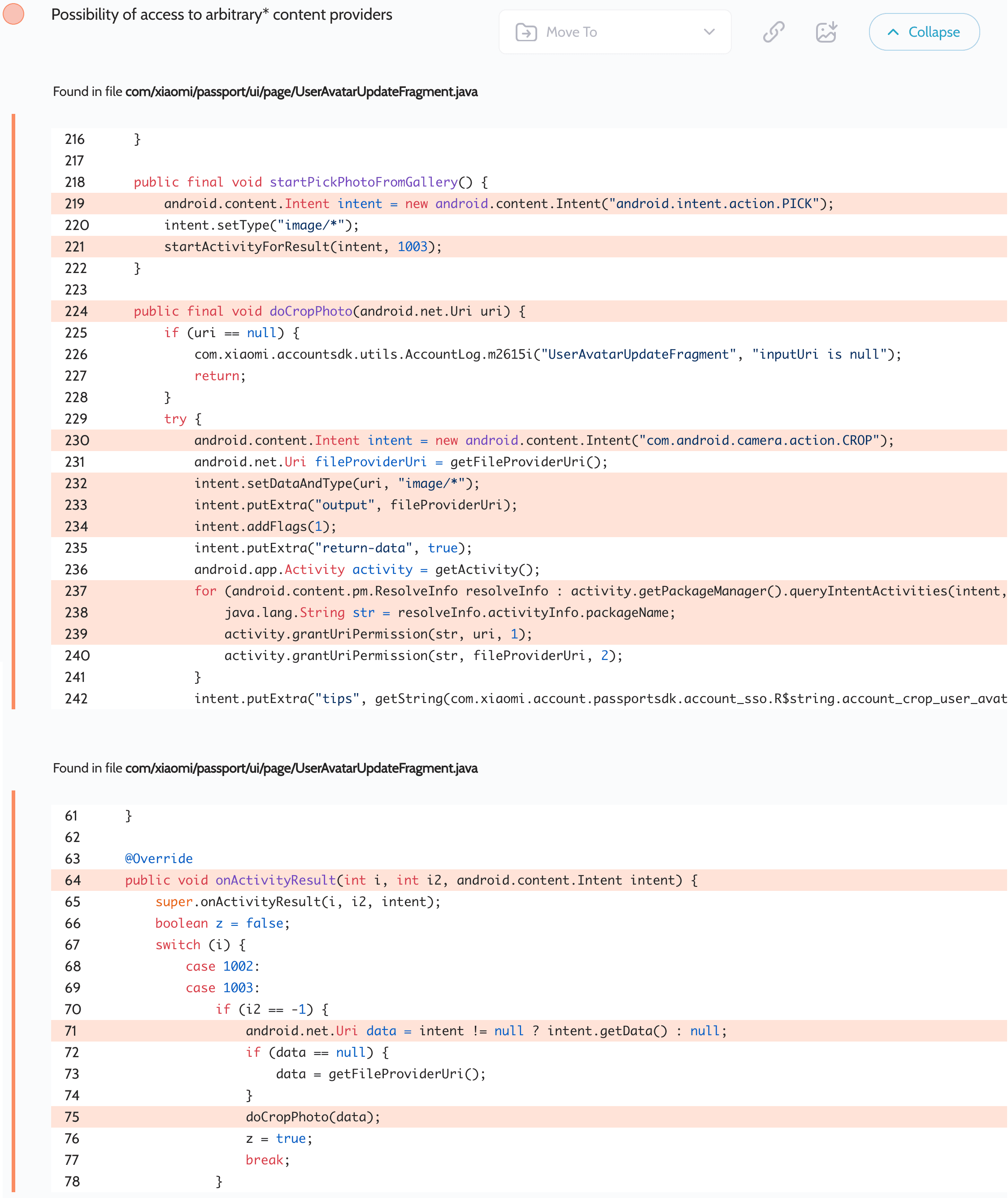 The application launches an implicit intent to select a URI for the user’s avatar. This intent can be intercepted by any third-party application installed on the same device. Then the app contains 2 bugs at once: automatically granting read permissions to all applications that can handle the com.android.camera.action.CROP action (for this purpose it is enough to create any exported activity that has a corresponding intent-filter) and then launching this intent with flag 1(Intent.FLAG_GRANT_READ_URI_PERMISSION) and the attacker’s URI in the data field, which allows to intercept this intent and also read data from this URI. This vulnerable code is present in several Xiaomi apps.