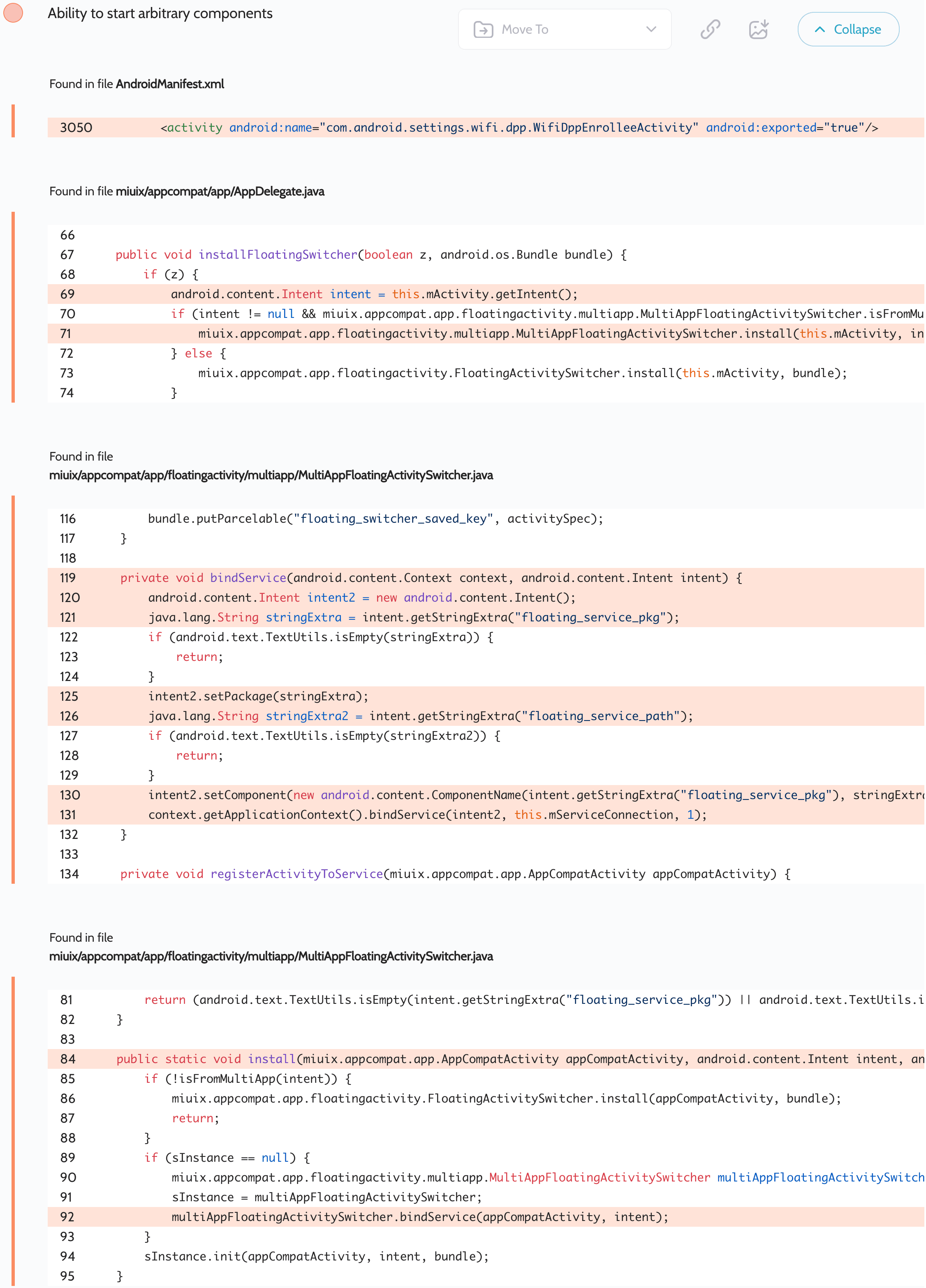 This app also comes from AOSP, but has been patched by Xiaomi. They changed the code in com.android.settings.wifi.dpp.WifiDppEnrolleeActivity, replacing the original initial inheritor of androidx.appcompat.app.AppCompatActivity with miuix.appcompat.app.AppCompatActivity. It has the miuix.appcompat.app.AppDelegate delegate which calls miuix.appcompat.app.floatingactivity.multiapp.MultiAppFloatingActivitySwitcher.install() where it accepts the attacker controlled values floating_service_pkg and floating_service_path. These values are treated as the component name used to bind the service. We believe this is an SDK issue as it is present in many Xiaomi apps, making them vulnerable. This is dangerous because an attacker can launch any potentially sensitive functionality in all apps installed on the user’s device.