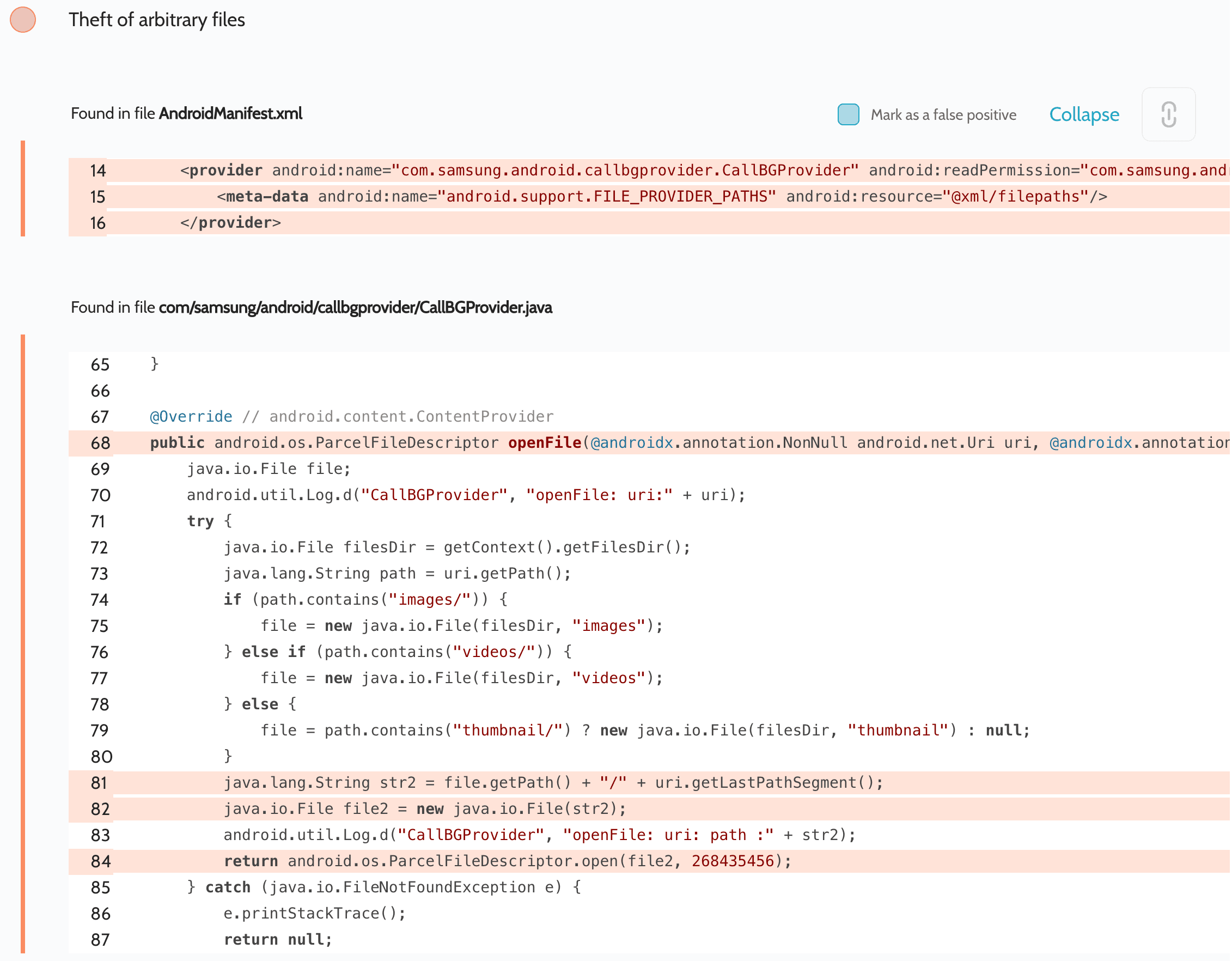 Oversecured has already described such errors. For instance, in the case of Google, this led to arbitrary code execution, where using a decoded value allowed gaining read+write access to arbitrary files. Another documented example allowed read-only access to arbitrary files with system privileges on Samsung devices: