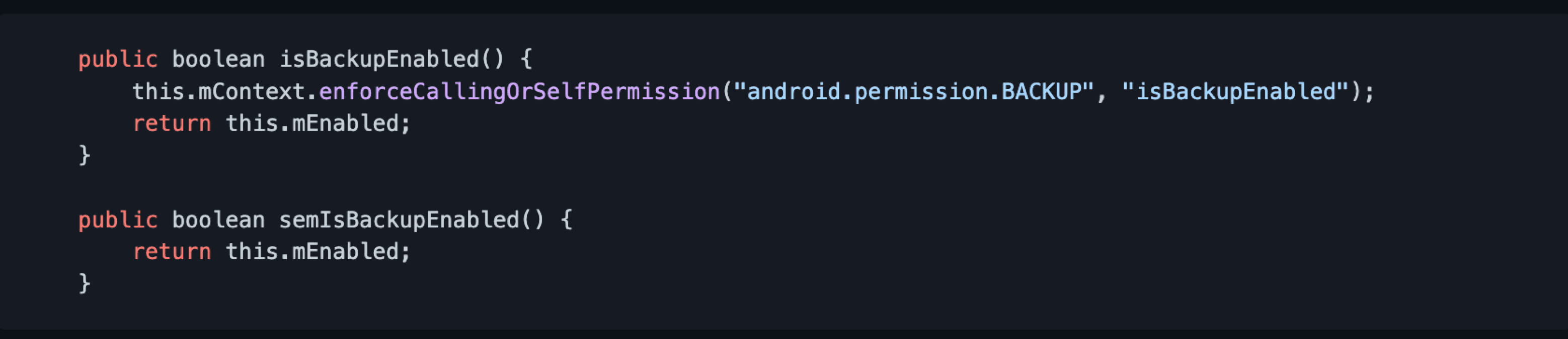 As you see from the screenshot, isBackupEnabled() is an AOSP method. The permission android.permission.BACKUP is required to find out whether backups are switched on or not. But Samsung added a custom method semIsBackupEnabled(), which returns the value with no checks at all.