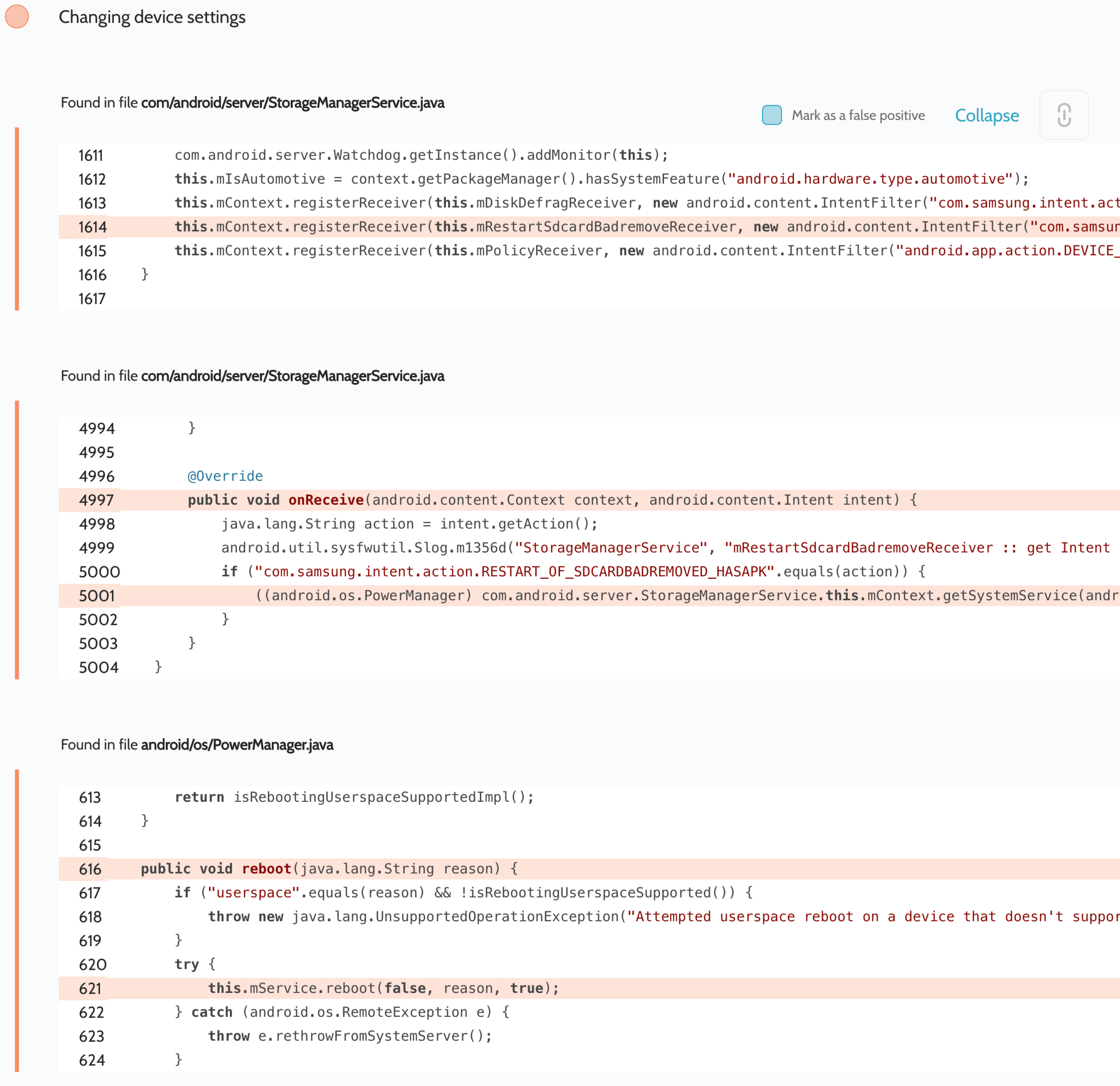 As an example of the scan results and of Android’s fragmentation, here is a vulnerability we discovered using a dataflow to control flow analysis of the Samsung Android Framework, in the patched file com/android/server/StorageManagerService.java: