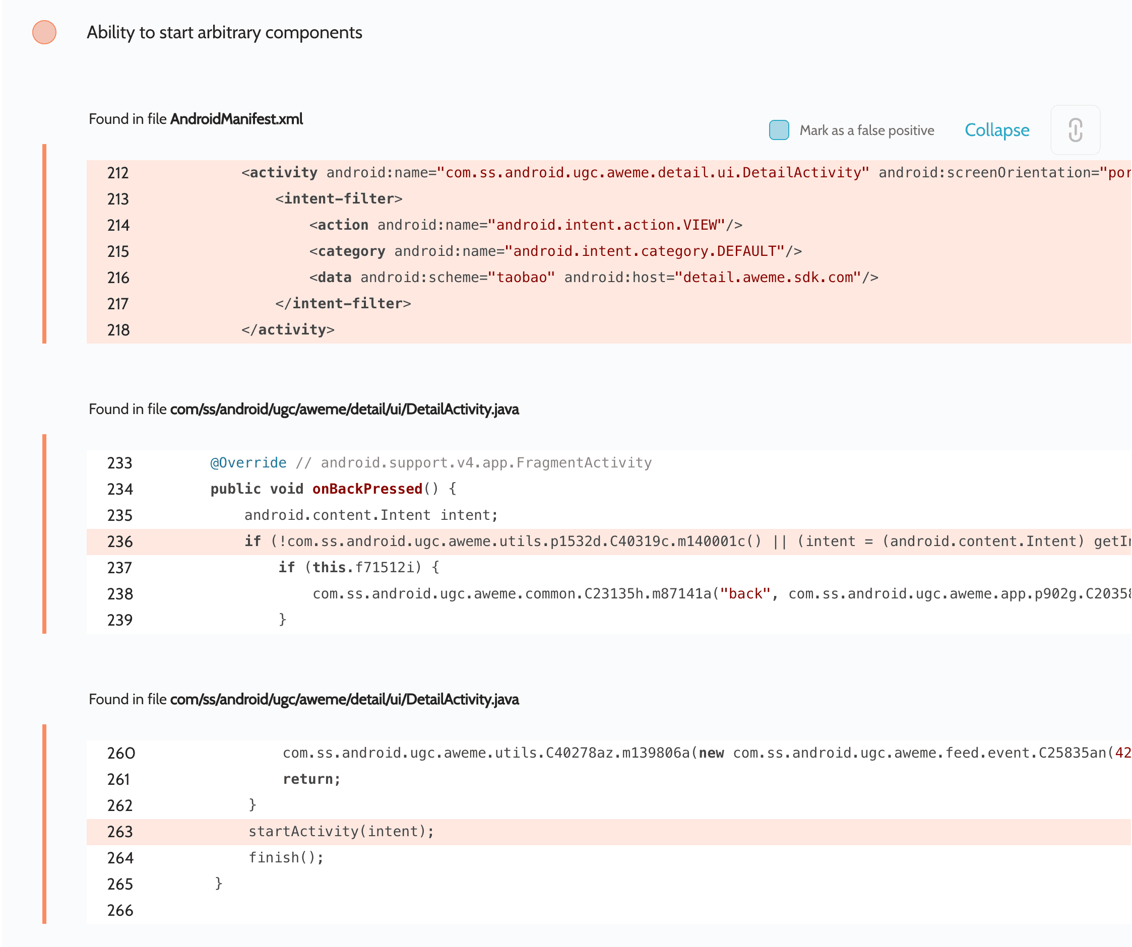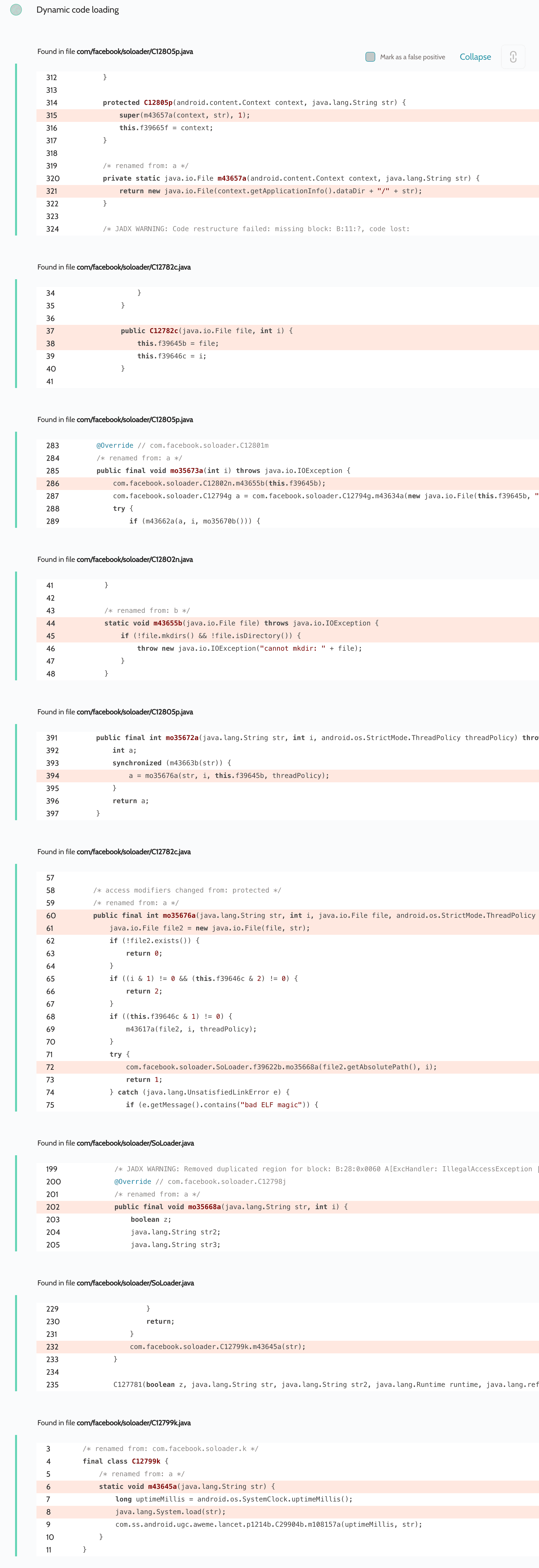 In this case we studied the app’s scan report once again, specifically the Dynamic code loading section, and found a lot of references in the app: