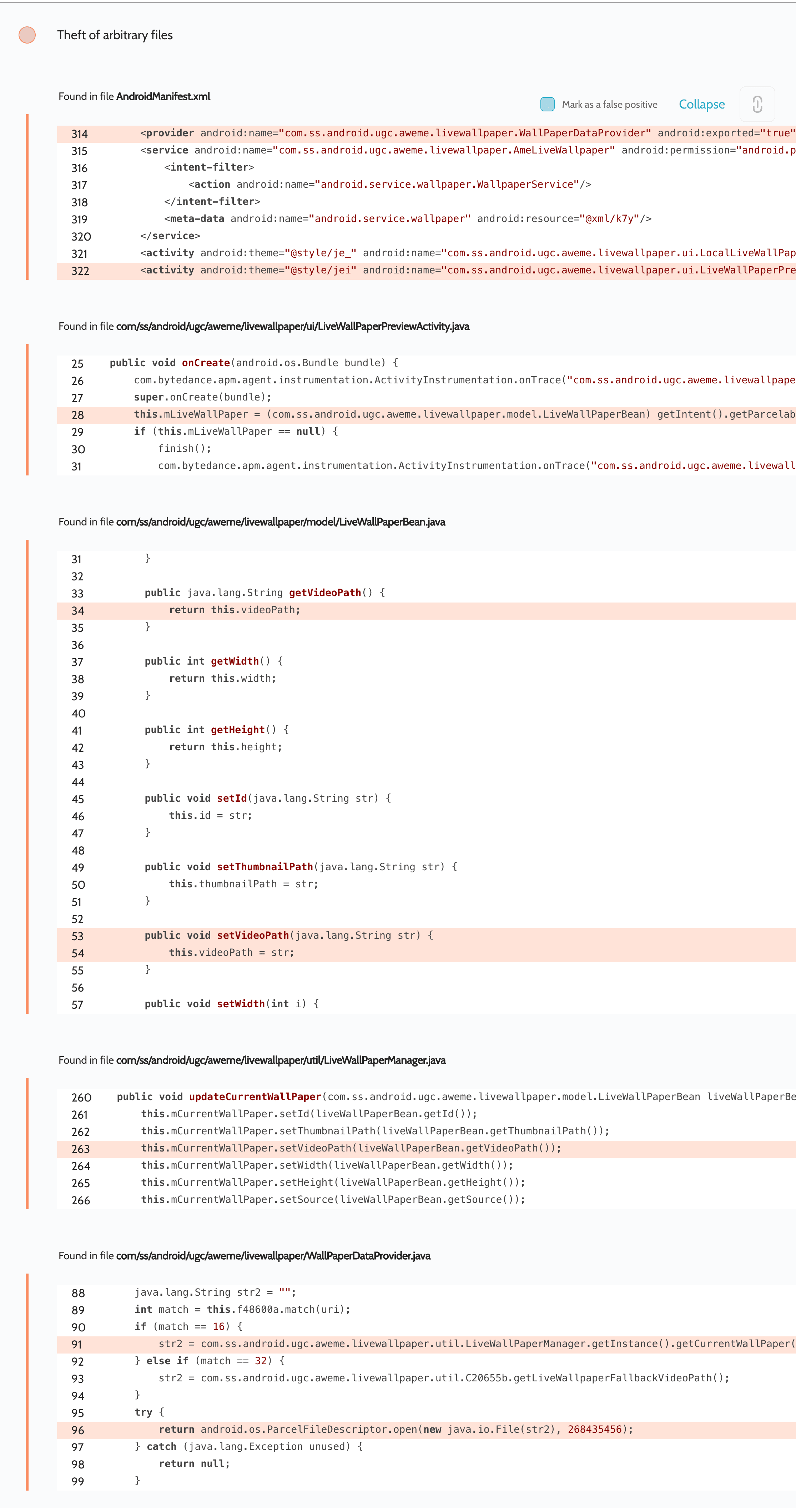 It turned out that the activity com.ss.android.ugc.aweme.livewallpaper.ui.LiveWallPaperPreviewActivity was exported and took an object of class com.ss.android.ugc.aweme.livewallpaper.model.LiveWallPaperBean in the live_wall_paper key, which was then written to a static field. The app then received getVideoPath() from this static field, in the provider com.ss.android.ugc.aweme.livewallpaper.WallPaperDataProvider, created a ParcelFileDescriptor and returned it to an attacker: