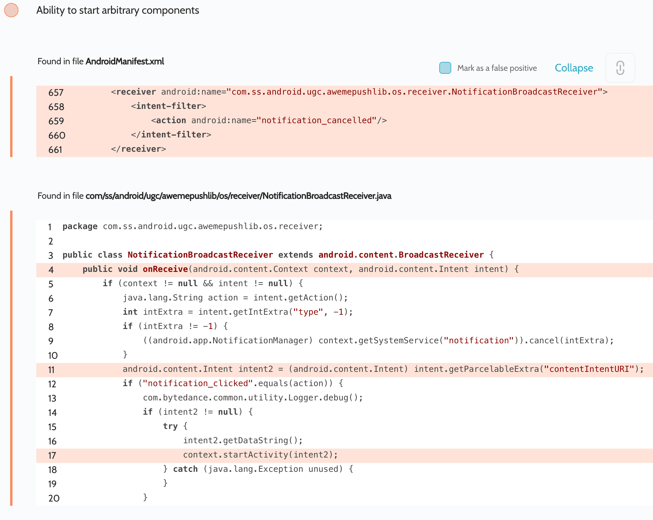 context.startActivity(intent2);It also receives an Intent from key contentIntentURI and passes it to startActivity(). Thus, an attacker gains the ability to launch arbitrary activities with arbitrary data and flag values. As we described in our article on Access to app protected components, the attacker can gain access to arbitrary Content Providers with the parameter android:grantUriPermissions="true". A provider like this was discovered in the TikTok app: