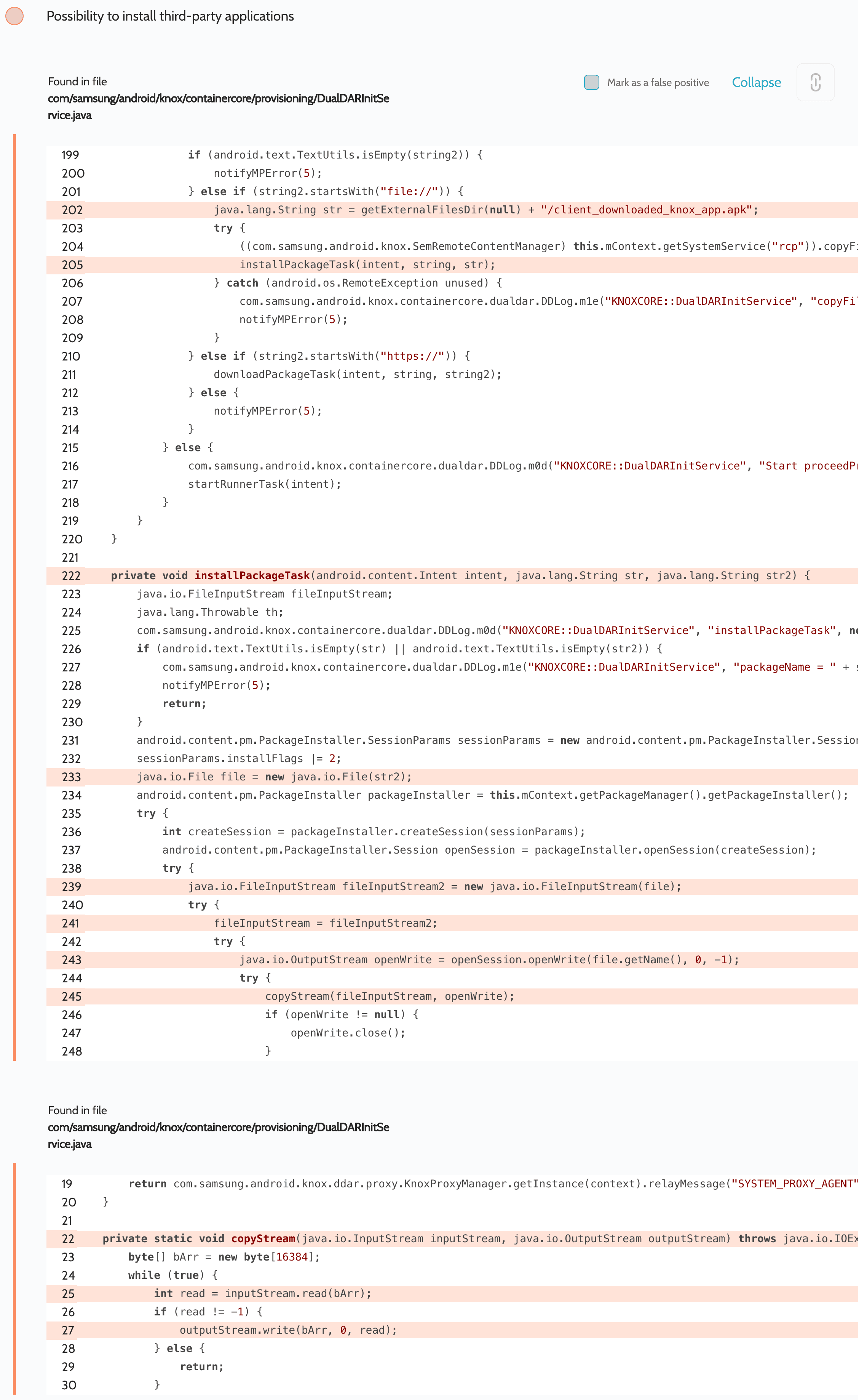 First, we scanned the Knox Core app and discovered that an app was installed from the SD card: